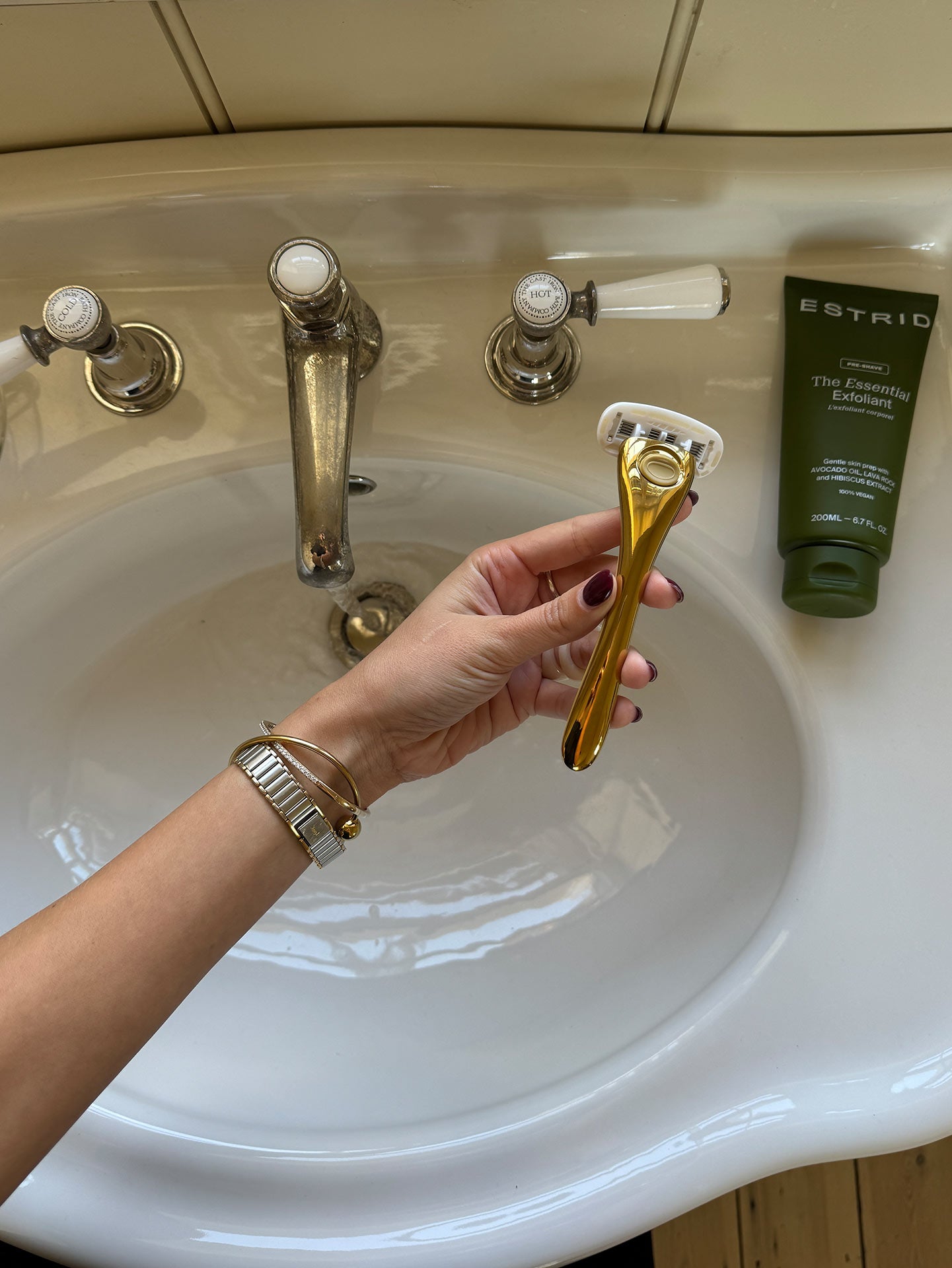 Conçu pour les peaux sensibles, le rasoir Estrid est doté de cinq lames tranchantes pour un rasage de près et d'une bande d'hydratation végétalienne pour protéger la peau, prévenir les irritations et offrir une glisse en douceur.